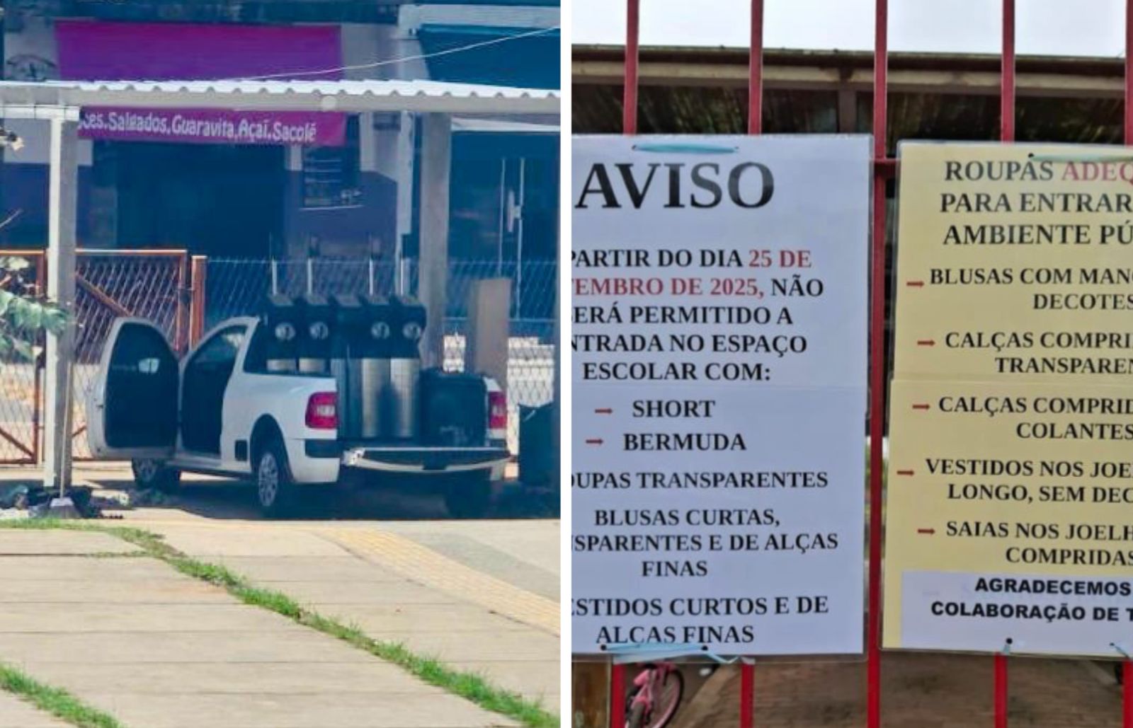Em meio ao cenário de crise, nossa equipe também recebeu imagens de avisos destinados a alunos e responsáveis, panfletados em frente a escolas. Neles, consta uma exigência para que os estudantes passem a utilizar determinadas roupas no espaço escolar a partir da última quinta-feira (25). O aviso também apresenta as vestimentas consideradas adequadas.