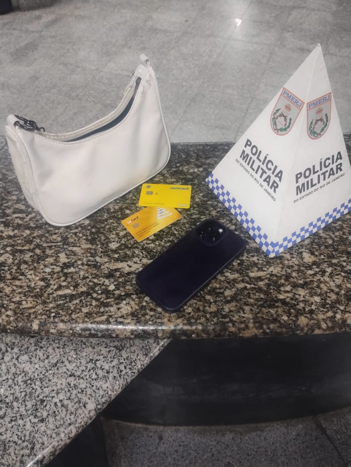 Na bolsa foram encontrados um celular, dois cartões de crédito e objetos pessoais da vítima. Com o suspeito também foi encontrado um cachimbo usado para consumo de crack.